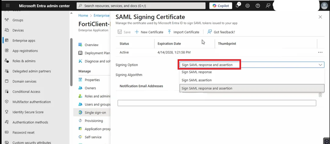 Trong Microsoft Entra ID, tại ứng dụng FortiClient hoặc FortiGate SSL VPN, vào SAML Signing Certificate và bật: