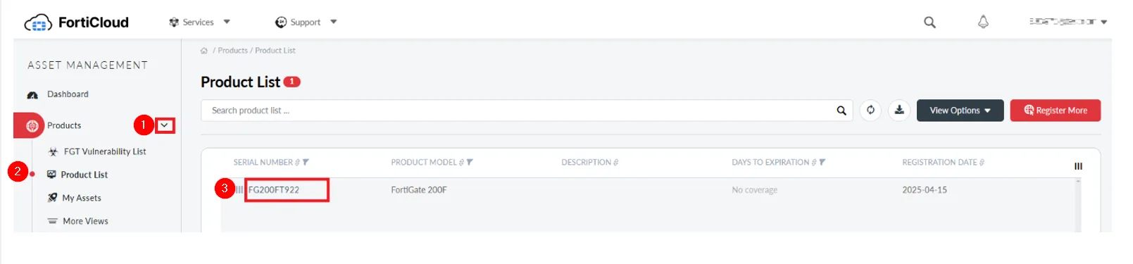 - Đăng nhập support.fortinet.com bằng đúng account quản lý thiết bị.