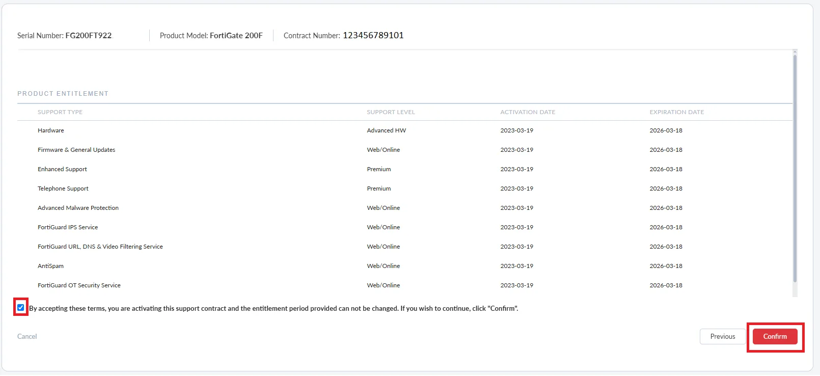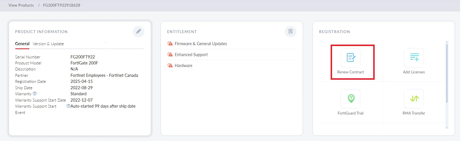 Sau khi thiết bị đã đăng ký (Register) thành công, bạn có thể Add (thêm) hoặc Renew (gia hạn) Support Contract để cập nhật quyền lợi hỗ trợ theo hợp đồng. Quy trình thực hiện trực tiếp trên FortiCloud Portal.