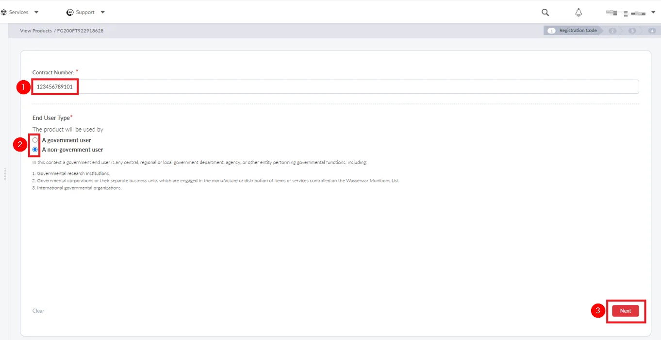 Nhập Contract Registration Code, chọn End User Type, sau đó nhấn Next.