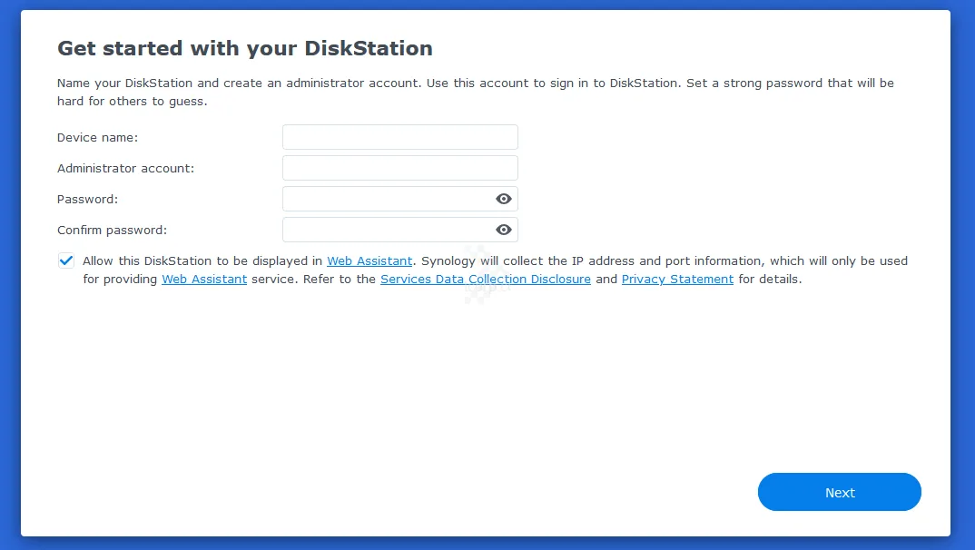 - Kết nối NAS bằng Web Assistant hoặc Synology Assistant