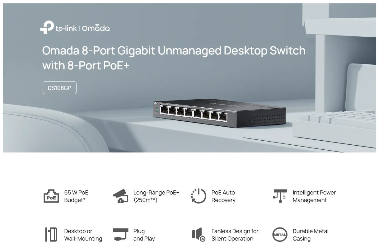 TP-Link DS108GP | Switch 8 Port Gigabit PoE+ 65W Truyền Xa 250m, Tự Động Phục Hồi, Cắm Là Chạy