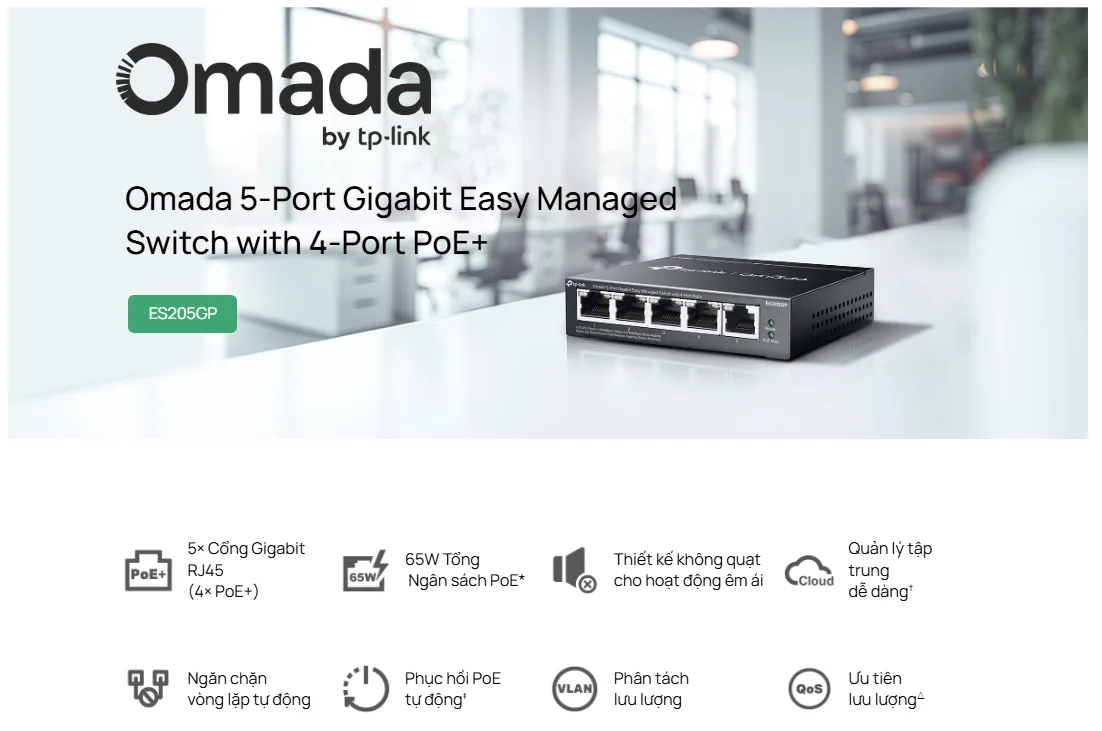 Trong môi trường làm việc hiện đại, việc triển khai camera IP, Access Point Wi-Fi hoặc điện thoại VoIP đòi hỏi thiết bị mạng có khả năng cấp nguồn mạnh mẽ, dễ quản lý và vận hành ổn định. TP-Link ES205GP được thiết kế để đáp ứng trọn vẹn nhu cầu đó – nhỏ gọn, thông minh, và dễ dàng quản lý qua nền tảng Cloud Omada SDN.