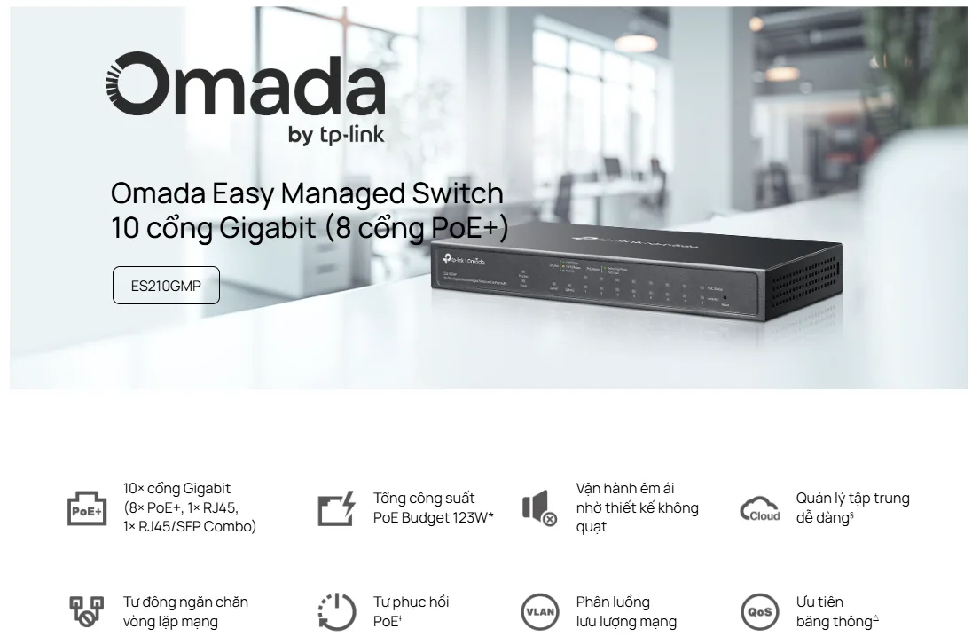 - ✅ 10 cổng Gigabit gồm 8 cổng PoE+ (802.3af/at), 1 RJ45 uplink và 1 combo RJ45/SFP.