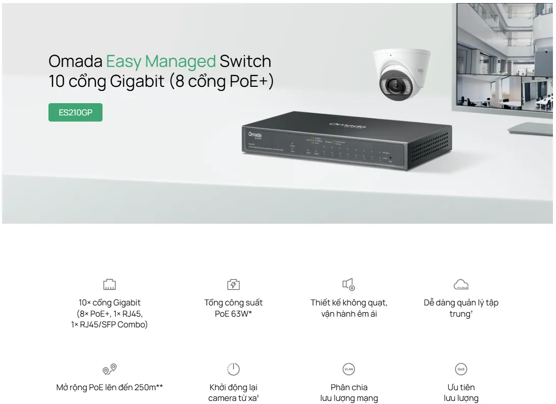- ✅ 10 port Gigabit gồm 8 port PoE+ 802.3af/at và 1 port combo SFP/RJ45 uplink
