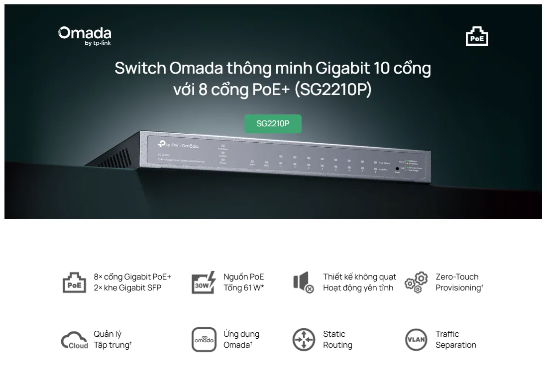 TP-Link SG2210P mang đến hiệu năng Gigabit ổn định, khả năng cấp nguồn thông minh và nền tảng quản lý Cloud hiện đại. Một thiết bị nhỏ nhưng tạo nên sự khác biệt lớn trong cách doanh nghiệp quản lý và vận hành hạ tầng mạng của mình.