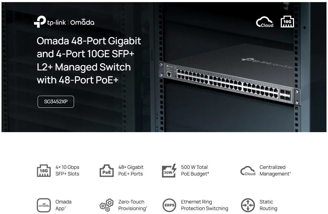 TP-Link SG3452XP là giải pháp “all-in-one” cho mạng doanh nghiệp: backbone tốc độ 10G, cấp nguồn PoE+ mạnh mẽ và quản lý Cloud toàn diện.