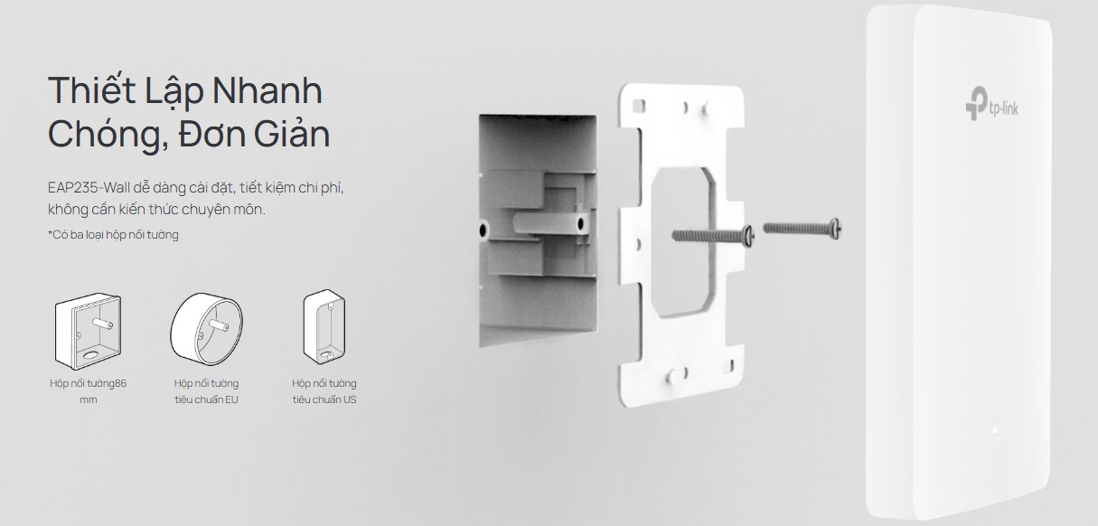 | Sản phẩm bao gồm | • Access Point Gắn Tường Gigabit MU-MIMO Wi-Fi Omada AC1200 EAP235-Wall • Hướng Dẫn Cài Đặt • Vít gắn |