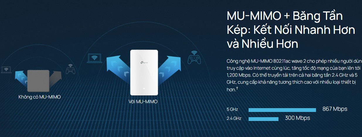 - ✅ WiFi băng tần kép AC1200: 300 Mbps (2.4GHz) + 867 Mbps (5GHz).
