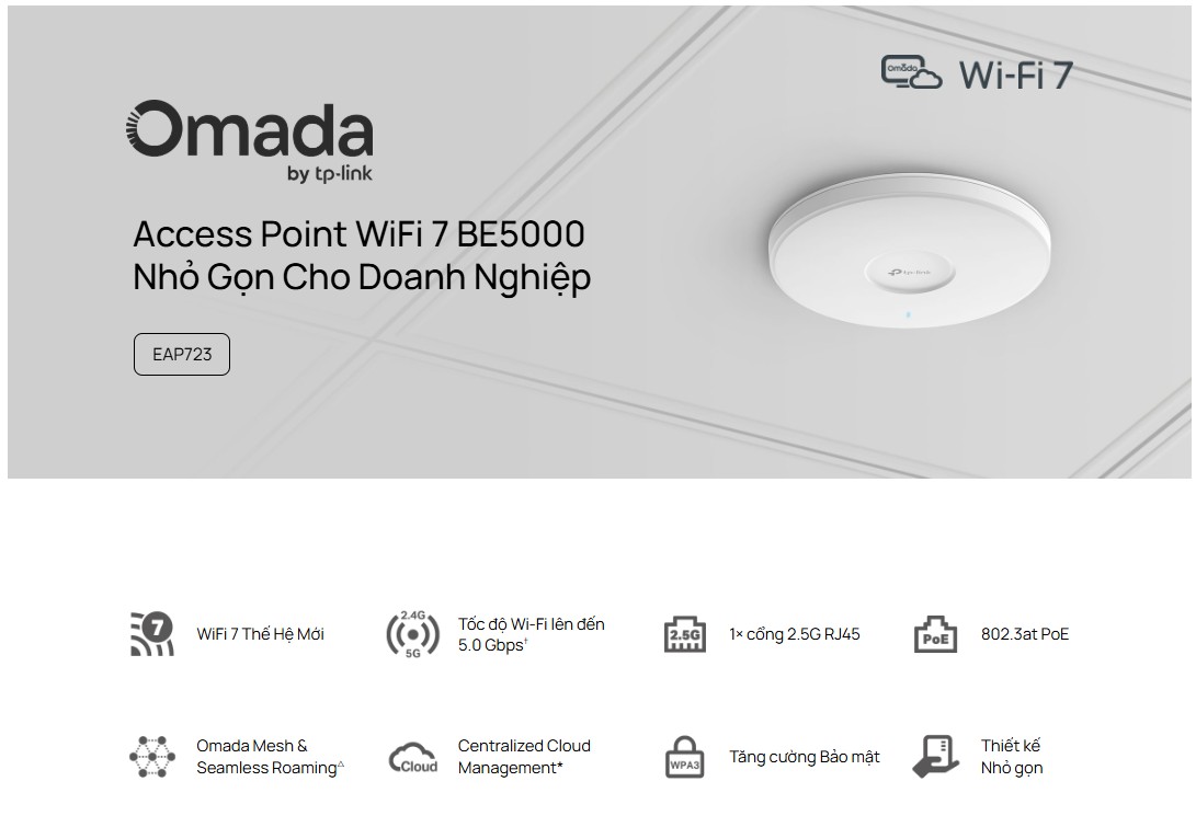 Sở hữu tốc độ WiFi 7 BE5000, cổng 2.5G tốc độ cao, công nghệ Mesh và Seamless Roaming tiên tiến, TP-Link EAP723 là lựa chọn hoàn hảo cho doanh nghiệp, khách sạn và văn phòng muốn nâng cấp lên thế hệ WiFi mới – nhanh hơn, mạnh hơn và thông minh hơn.